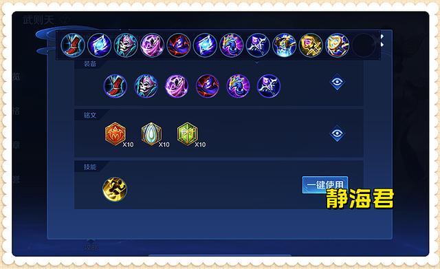 目前中路胜率一姐(武则天)的推荐出装是:冷静之靴、痛苦面具、破茧之衣、博学者之怒、回响之杖、虚无法杖。