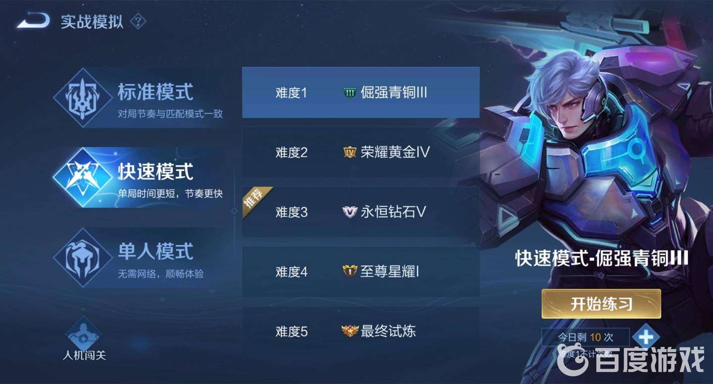 实战模拟模式位于实战5v5人机处,快速模式是最佳的刷取熟练度的方式。不同档次的人机对应的熟练度上限不同,但由于难易问题,在刷熟练度时的选择应该为:难度1对应白-蓝标,难度4对应蓝-紫标题,难度5对应紫-红标。
