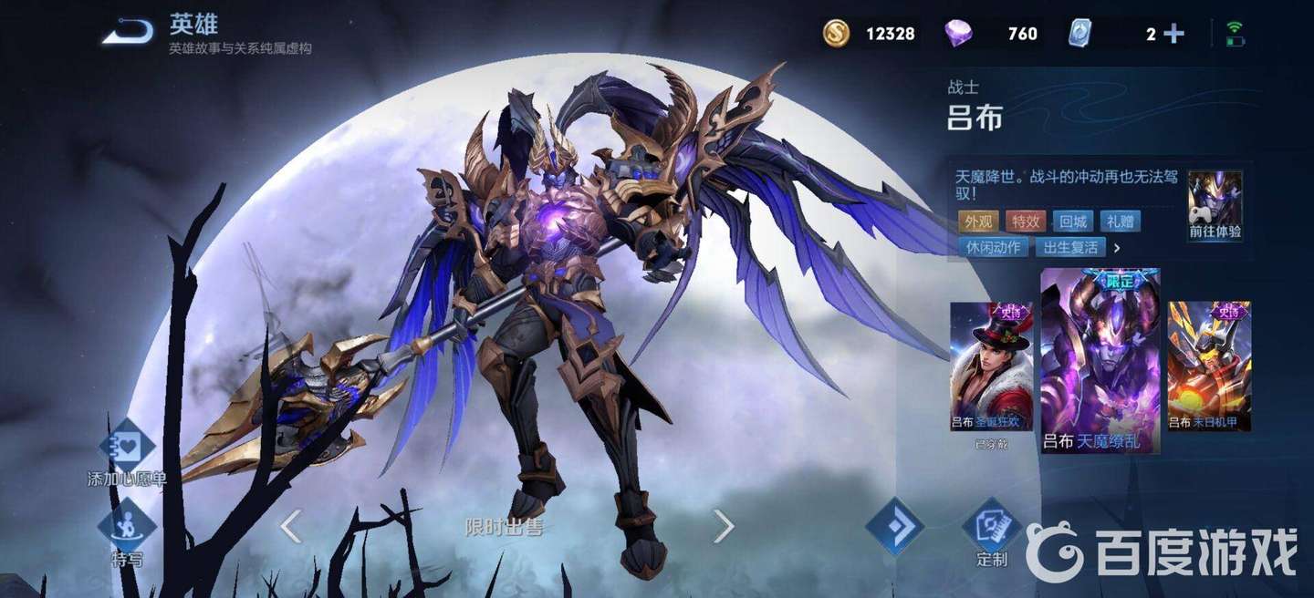 5、吕布天魔缭乱。吕布的天魔缭乱这款限定皮肤,这款皮肤主体的色调是暗蓝色的,所以其大招的范围感觉会非常远,许多吕布玩家都喜欢这款皮肤,手感会非常好