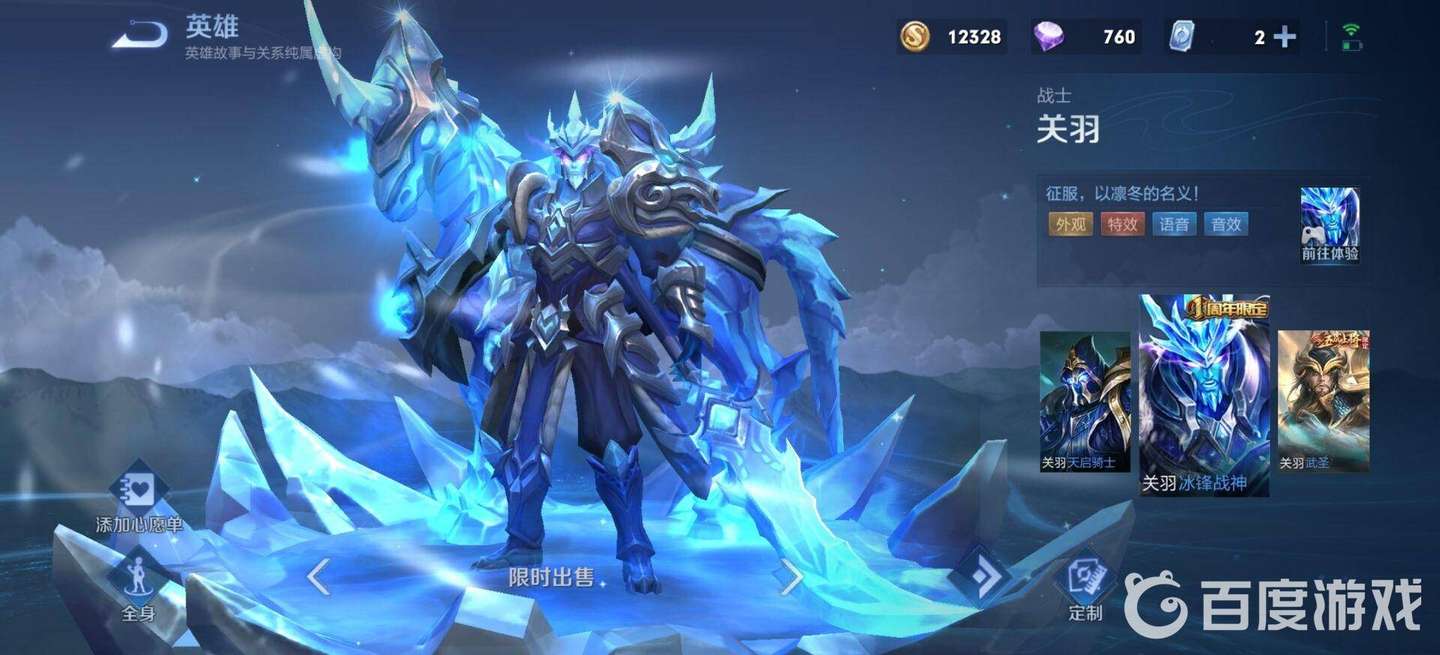 9、冰封战神。冰封战神这款皮肤也是关羽皮肤当中手感最好的,作为一周年限定的皮肤,该皮肤不仅仅是情怀,更多的是特效也好看