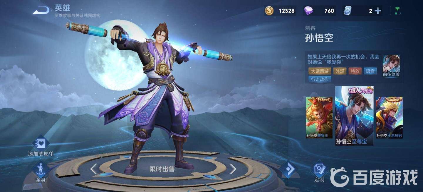 3、至尊宝。至尊宝是王者荣耀英雄孙悟空的情人节限定皮肤,和露娜的紫霞仙子是情侣皮肤,获得了电影《大话西游》的官方授权,将深入人心的至尊宝形象完美的体现了出来