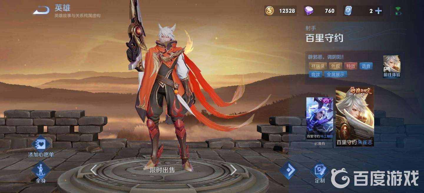 6、朱雀志。百里守约的朱雀志这款限定皮肤,这款皮肤主体采用的是金色的元素,百里守约人物的建模因此变得更加帅气,强化了人物头上的耳朵和尾巴。