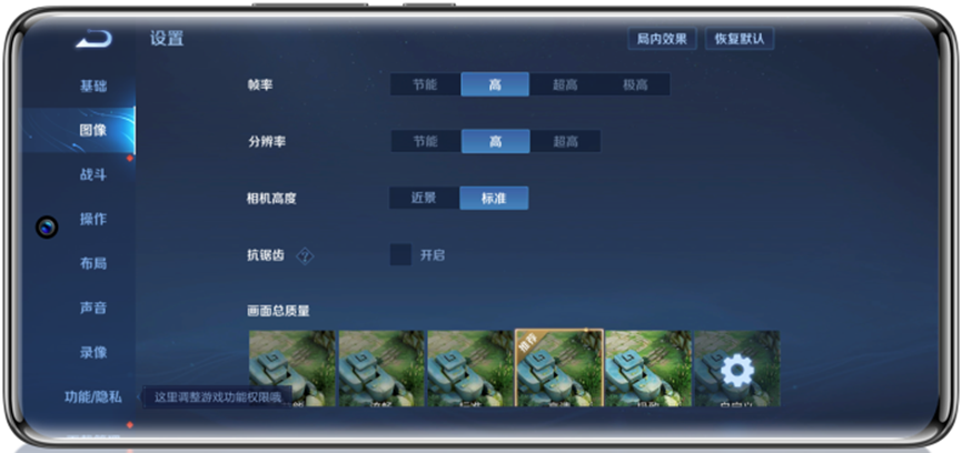 例如:玩王者荣耀游戏时,建议您适当调高游戏中的帧率设置,节能/高/超高/极高的帧率设置会分别带来30/60/90/120帧的游戏体验,但帧率设置越高,设备更易发热,请按需调整设置。此外,不同设备会有适配不同的帧率设置,请以实际设备显示为主。