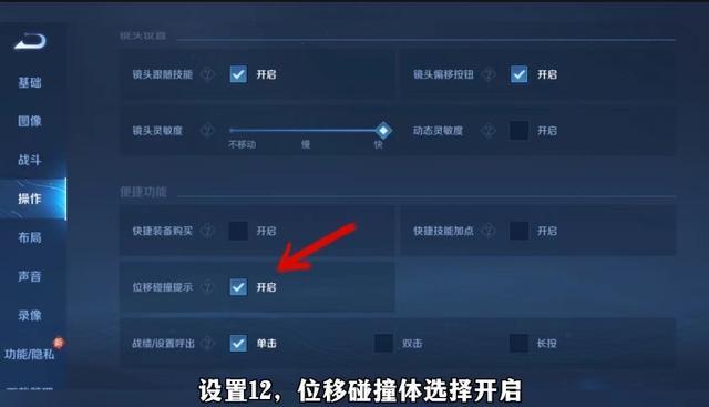 设置12.位移碰撞提选择开启,这样当英雄用技能位移的时候,可以看到墙体外有明显的落点提示,有助于我们穿墙,适合所有英雄设置开启!