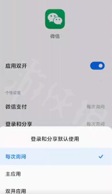 3.在【应用双开】中找到微信程序,将【登录和分享默认应用】设置为【每次都询问】即可。