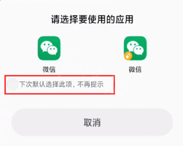 3.在【应用双开】中找到微信程序,将【登录和分享默认应用】设置为【每次都询问】即可。