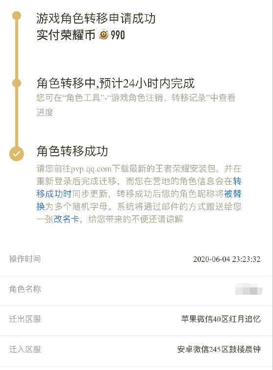 然后跳转到转移记录界面,可以看到我操作的时间,还有转移的情况,刚开始提醒我24小时内完成,等了1分钟直接提醒我转移成功了,于是我立马安卓登陆游戏进入相应的区服,看到了我的角色,我的名字是一串数字+英文,很长很拉风,因为看着很爽我就没有改名字。而若想改的话,通过系统送我的改名卡就行了。至此,我的角色跨系统转移圆满完成了。