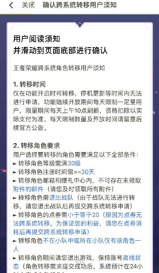 想要进行角色跨系统转移,一定要按照官方的要求严格进行。第一,你不能在战队中,若是你在战队里,那么你就退出战队。第二,不能在小队中,或者小队只能有你一个人。若是你不是队长,那么你就退了小队,若是你是队长,那么你就踢掉你的队员,小队只有你一个人存在。第三,点卷不能多于20.尽量能消费就消费了。第四,转移的角色等级必须是30级的号。第五,转移的角色必须是超过30天注册时间。第六,你的邮箱和赠礼中心不存在未领取的附件和邮件。第七,转移期间必须退出游戏不在线。第八,同一个账号,90天内只能转移一次。满足了上边这些条件的话,你就能进入王者营地操作转移了。