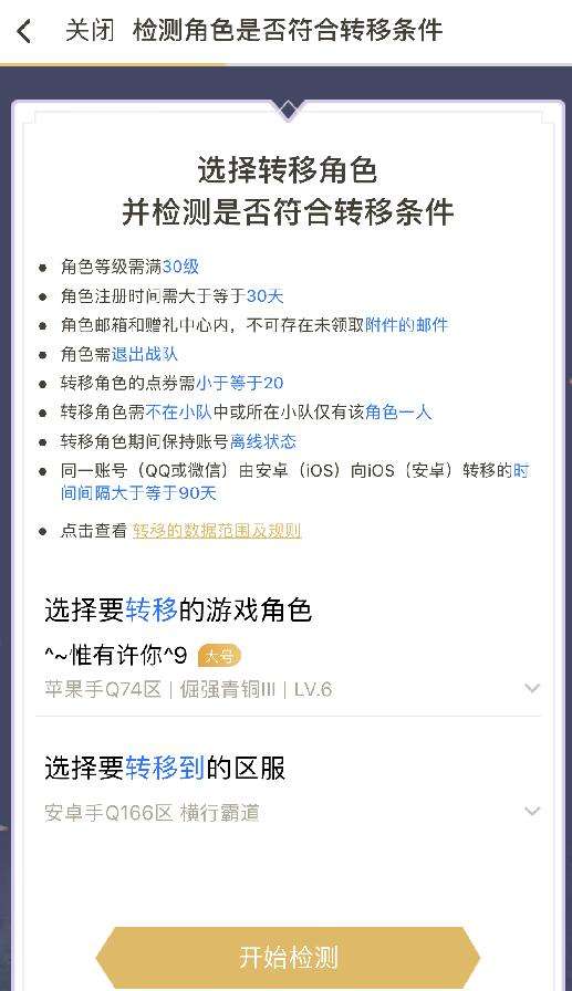 此时,我又进入一个界面,这里是检测角色是否符合转移条件的,可以直接看到我账号下的游戏角色,然后选择我想要转移的那个角色,接着选择我需要转移到哪个区服。(这里提醒一下,能转移到的区服,通常都是新区,还不能有这个账号注册过角色。苹果微信转安卓微信,苹果q区转安卓q区,或者安卓微信转苹果微信,安卓q区转苹果q区。不能微信和q区互转。)然后我点击检测,开始检测我的角色能否进行转移,我先试了一个不满足条件的角色,然后提示我当前角色不可转移,然后列举出原因。接着我又用按照转移要求操作了的角色进行检测,因此直接进入了充值界面。