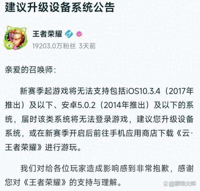 比如最近王者荣耀的官方发布公告,将禁止两款手机登录游戏,很多玩家被迫换手机,这是一则建议升级设备的公告,如果没有升级将直接禁止登录游戏。