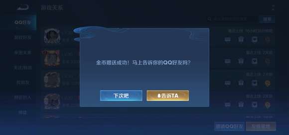 3.金币赠送成功后,可选择是否告诉好友,并且赠送成功后会增加二人之间的亲密度。