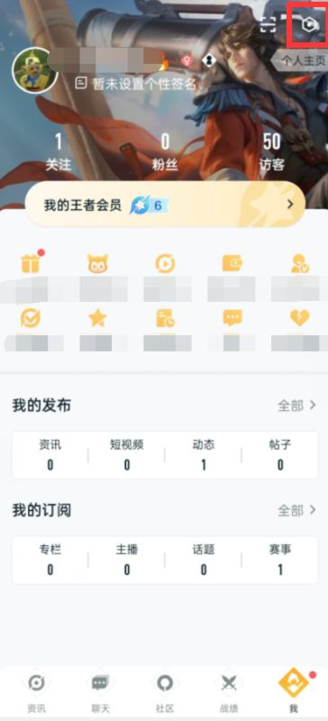 首先,在王者营地首页找到右上角的设置图标并点击进入。