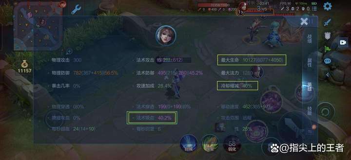 这是貂蝉的神装面板,万血满冷却,782物抗,495法抗,尤其是40%的吸血尤为扎眼。