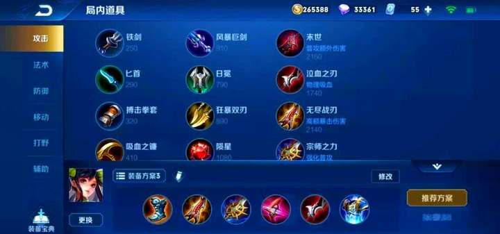 至于最后一件装备,则可根据实际情况选择复活甲、名刀或破军,以增强其生存能力或输出能力。