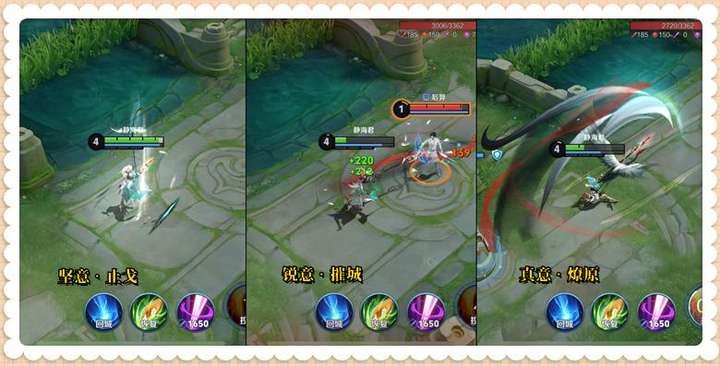 坚意-止戈(近距离):使用后,可以围绕自身周围,连续攻击四次,该技能可以移动释放,且云缨自身可以获得护盾和加速效果。