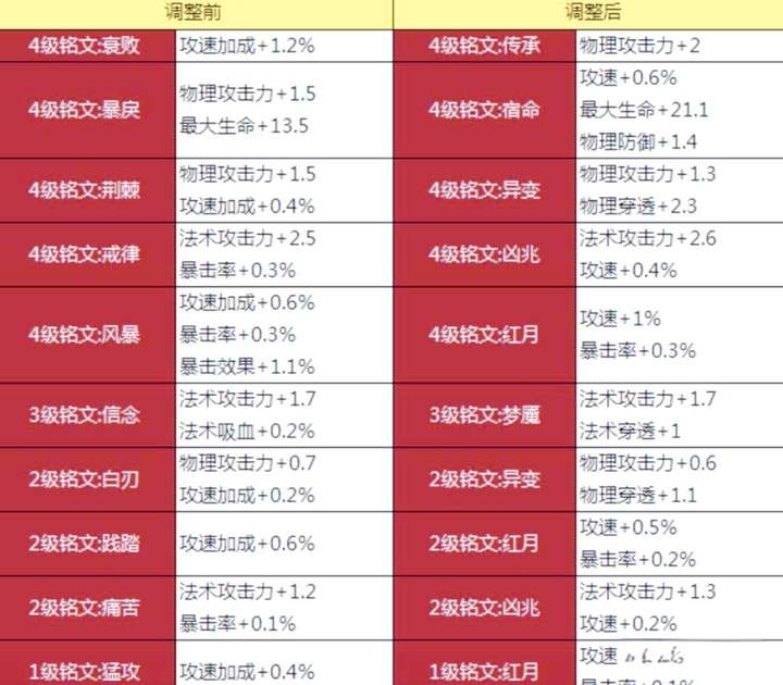 通过观察铭文属性的对照表,我们可以发现,尽管命名上有所调整,但各等级铭文的属性变化并不大。每个铭文等级都对应着特定的属性加成,使得玩家能够清晰地看到自己所需的铭文效果,从而做出明智的选择。