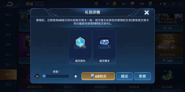 周卡礼盒需要68点券,使用后便可立即获得68铭文碎片,并且一周最高可获得385碎片铭文,也就是一共最高可以获得453的铭文。
