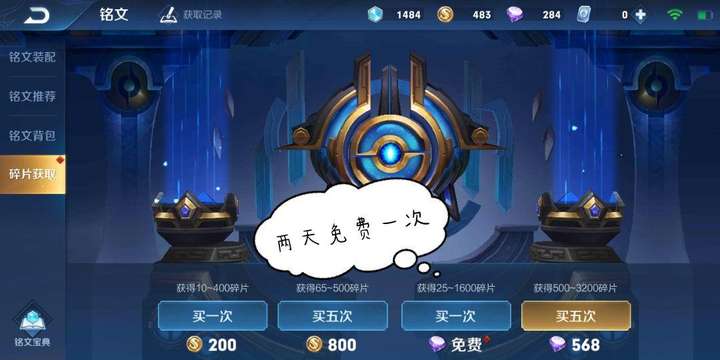 而免费单抽则是两天刷新一次,如果每次保底25碎片,第5次为400碎片时,那么我们一共需要960天便可获得一套5级铭文。