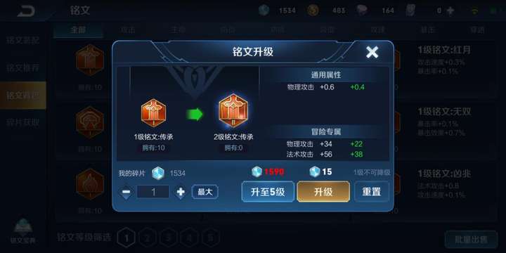 点击“升级”按钮,消耗相应数量的金币或铭文碎片。