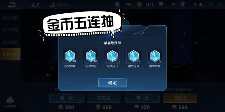 800金币5连抽可以有几率获得65-500铭文碎片,每次保底为65铭文碎片,大部分连抽情况下都是会获得至少100多的铭文碎片。