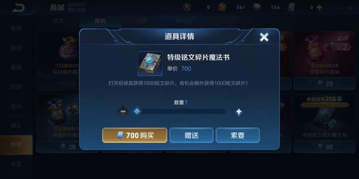 其中特级魔法书需要700点券购买,便可保底获得1600铭文碎片,有机会额外获得1600铭文碎片,也就是70块钱可以保底买一个5级铭文,有可能70块钱买两个5级铭文。