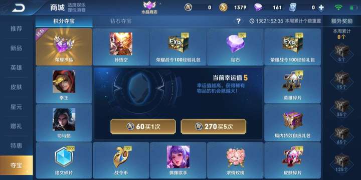 钻石抽奖和金币抽奖一样分为两种方式,一种是单抽,一种是5连抽。