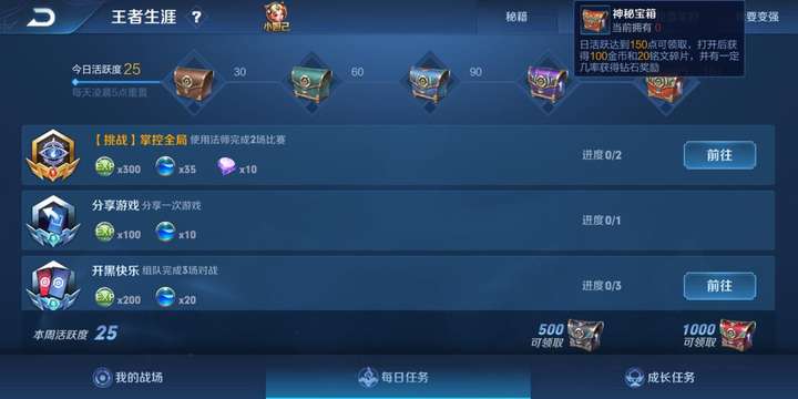 每天把所有的任务宝箱给领完了,可以获得50的铭文碎片,当完成任务后达到了每周的任务活跃度宝箱时,我们一共可以领取2个箱子,也就是300的铭文碎片,每周都一共可以获得650的铭文。