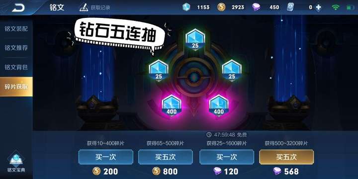 而免费单抽则是两天刷新一次,如果每次保底25碎片,第5次为400碎片时,那么我们一共需要960天便可获得一套5级铭文。