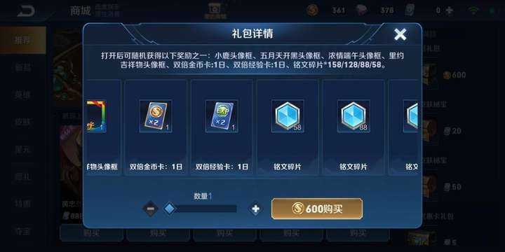 例如最近出的头像框金币购买活动,600金币开头像框的箱子,而箱子中有着丰富的铭文碎片,基本600金币开的都是铭文碎片,而且都只有几十,血亏。