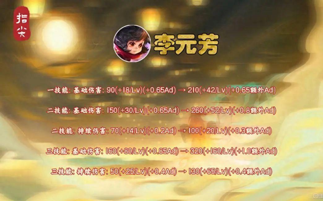 所以总结一下:本次调整前期全面加强了李元芳的强度,不过只是微加强了一点伤害,后期1技能单技能的伤害降低一点,或者持平(根据出装),但二三就技能的伤害和威胁会变得更大,新版本物攻越高,伤害增幅越明显,但李元芳整体是加强的,不止是自身。