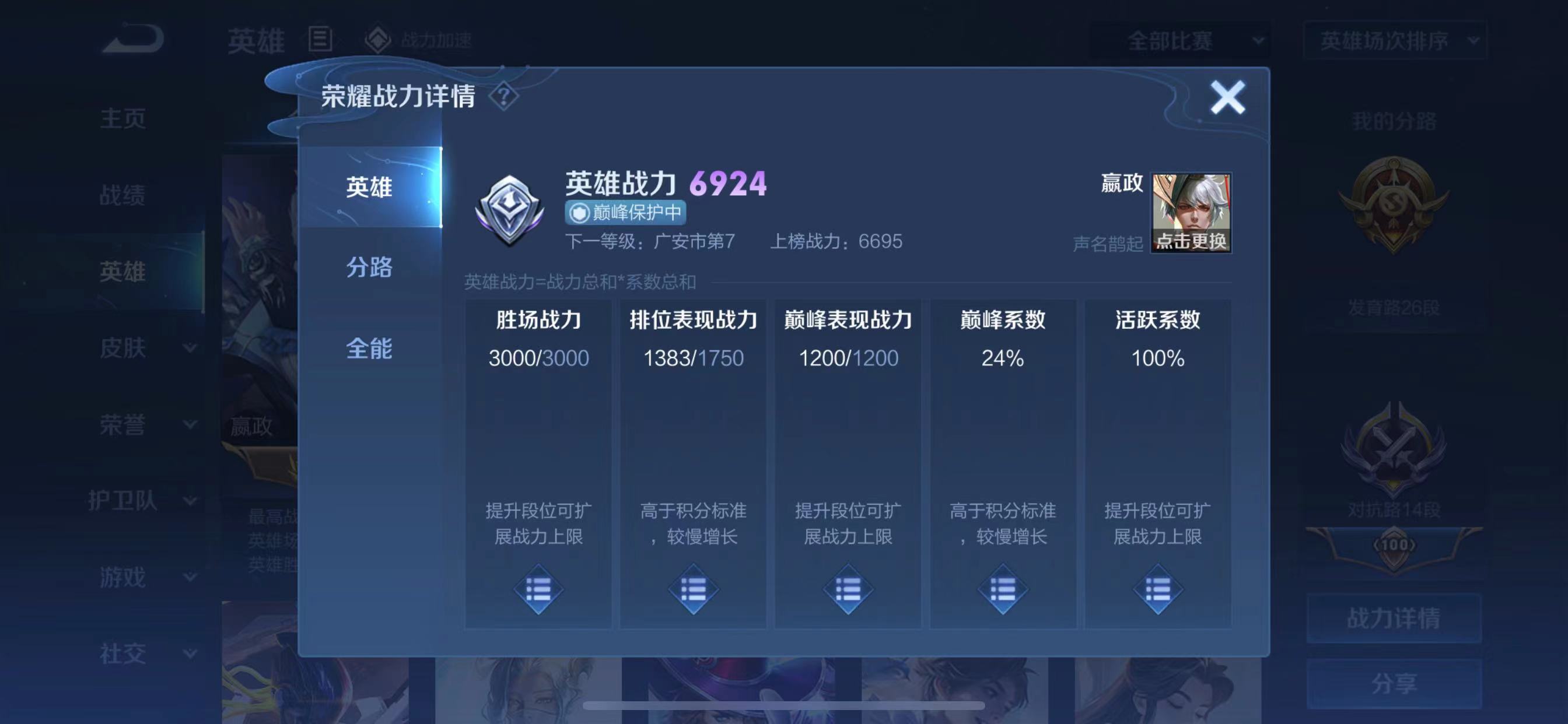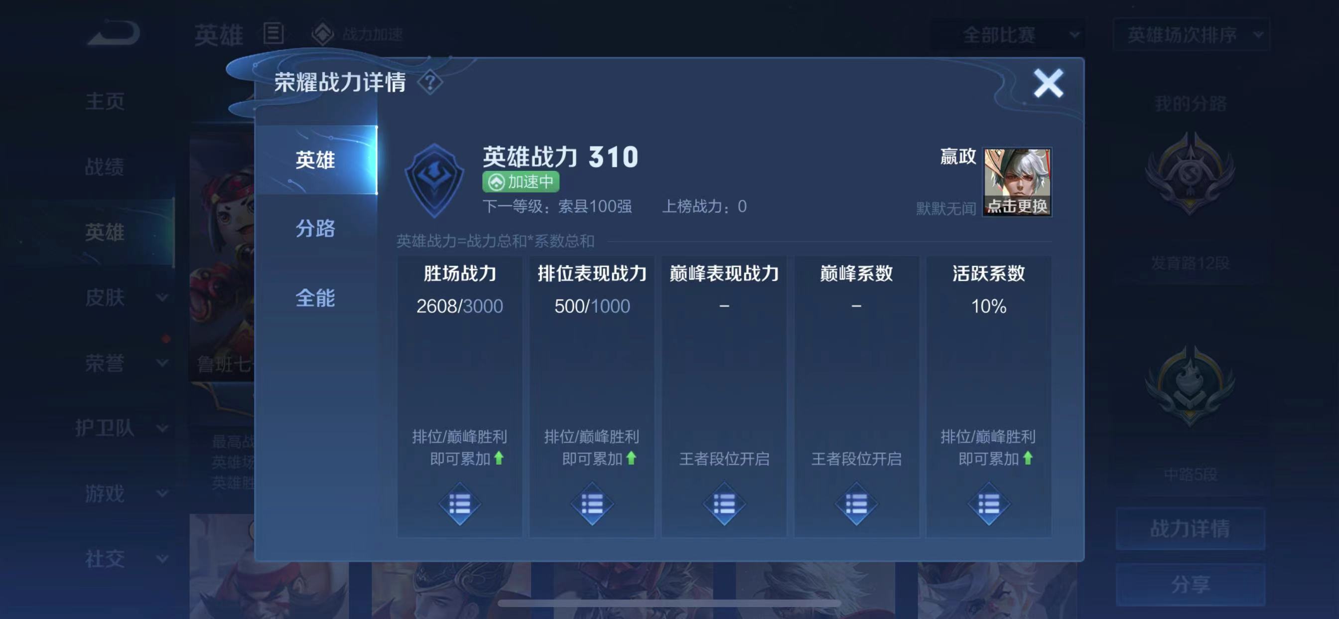 点击英雄那一栏,就可以看你的英雄当前战力,英雄可以更换,以我的嬴政为例,战力的组成分为:胜场战力,排位表现战力,巅峰表现战力,巅峰系数,活跃系数五项,计算方法为(胜场战力+排位表现战力+巅峰表现战力)*(活跃系数+巅峰系数)。