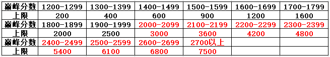 表内黑色为我亲测无误的,标红的为我网上查的资料,毕竟我巅峰最高就打到1900多分(手动捂脸),再高就没见过了。