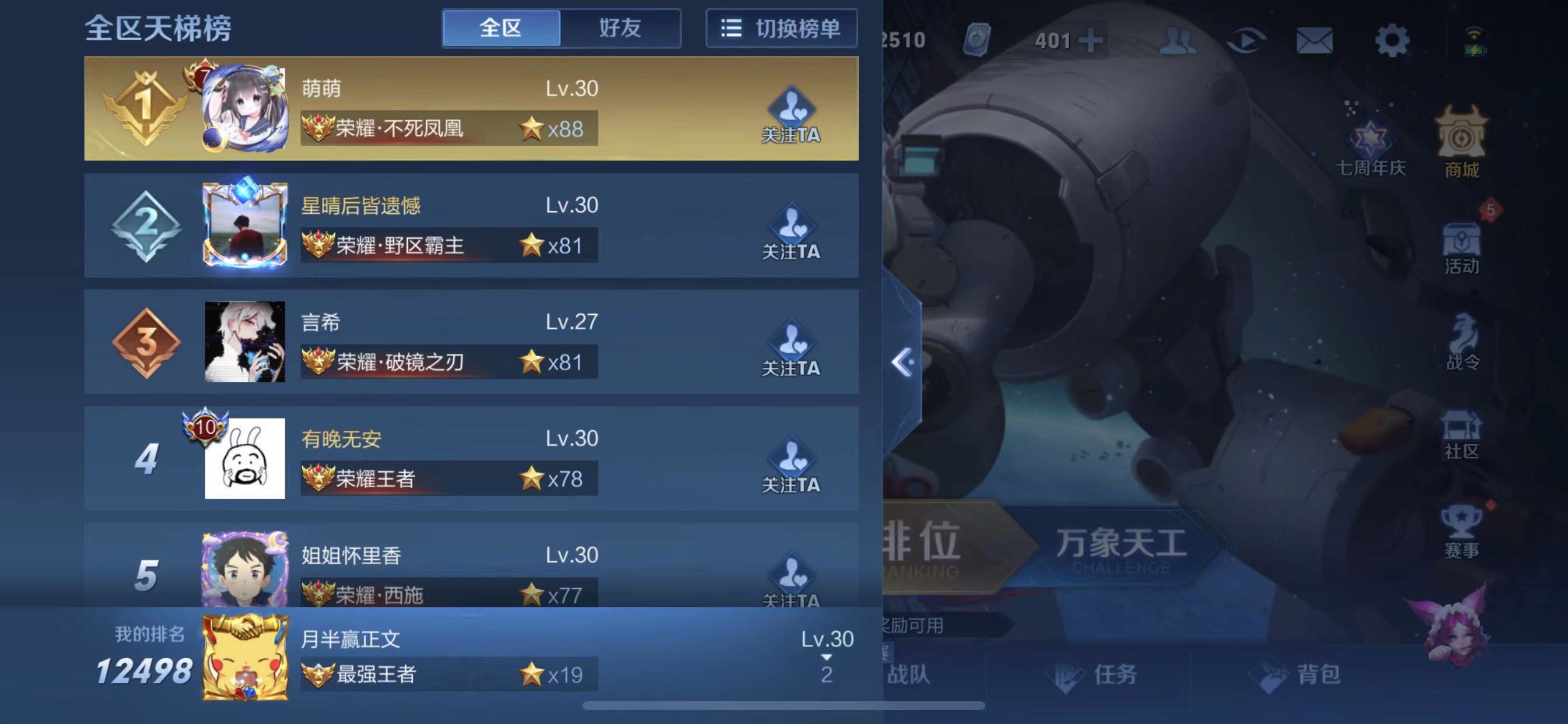 然后回到正题,战区定位完成之后,你就可以查看你所在战区每个排名表所需分数,开头我放的截图的里面标注的二那里点击进去,记住点之前要看好友头像上面是否显示的排行两个字,如果是显示的好友(跟狗蛋截图一样),就要切换一下,显示排行后,点击就会出现如下界面: