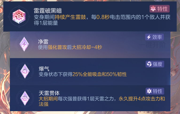 爆气是必须的,可以进一步提升我们的吸血能力,搭配泣血之刃,残血也能一拳加满。其他的三个就看出什么拿什么就可以了。净雷是比较重要的,因为大招如果没有这个天赋冷却时间太长,真空期长了玩这个模式体验会大幅度下降。