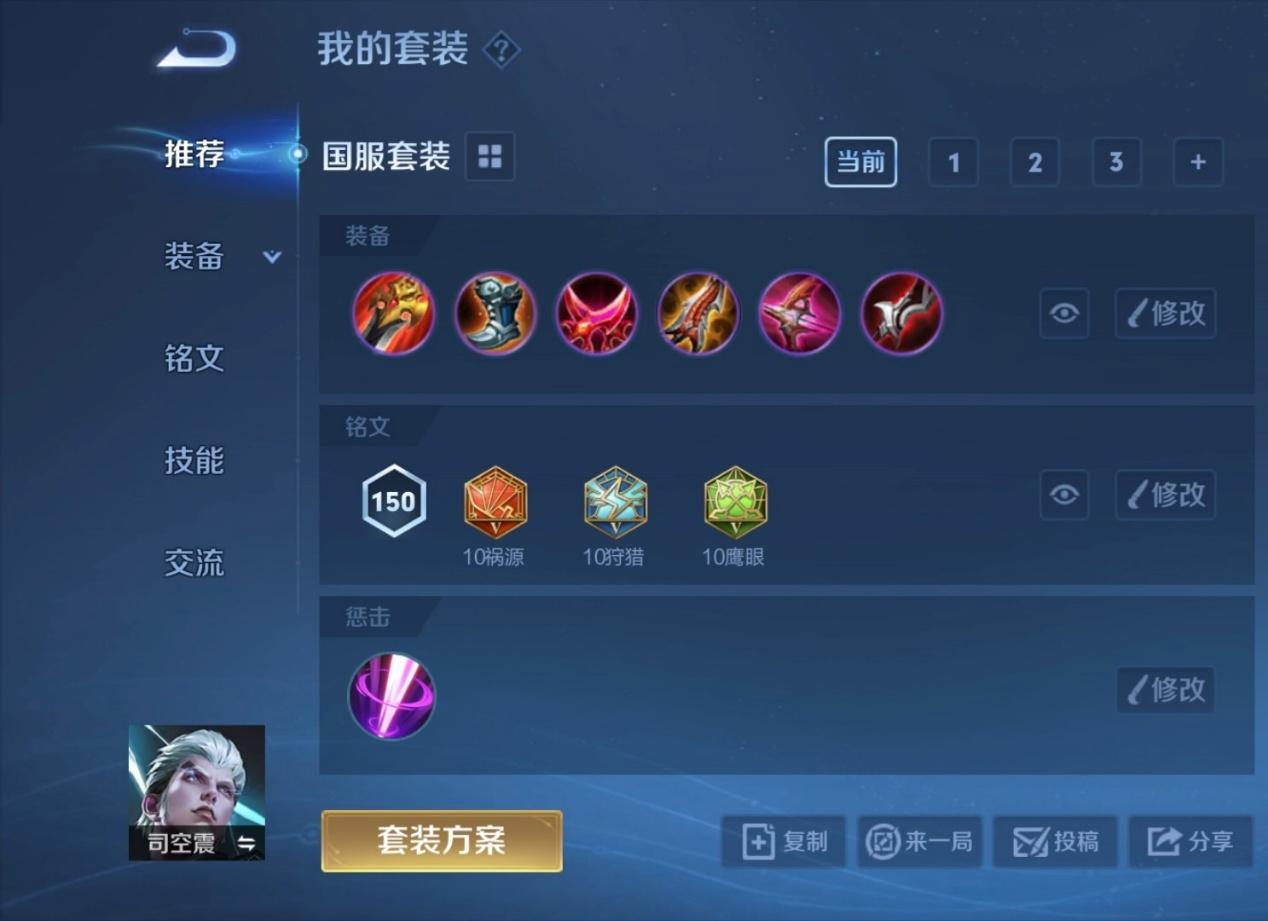 出装铭文在这个模式里是最重要的,我们直接选择全输出装备,可以带个惩击去打野加速发育。因为司空震在这个模式里同样很吃经济,需要快速发育拿到装备和积累天赋加点,中期开始才能发力。