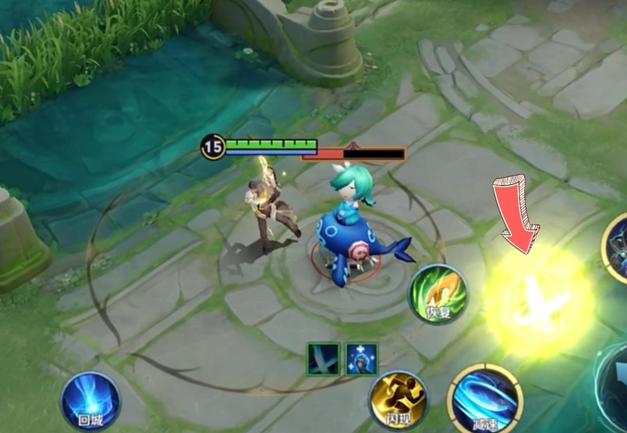 当我们使用一技能之后,我们向后拉,就可以延长飞镖的飞行时间。这也就影响了我们一技能的回复速度,所以我们就需要先使用一技能,然后立刻向前方使用二技能接近敌人,我们通过向前位移去迎接我们的飞镖,从而缩短飞镖的飞行距离。这样我们就会提前接到了飞镖,从而加快我们的回复时间,这就是快速回复。这就是我们换血的一个常用小技巧。