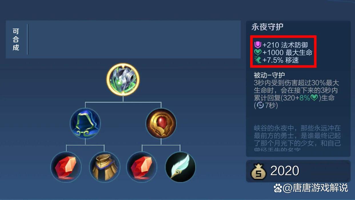 第五件装备的选择,需要根据阵容情况调整,当敌方比较灵活时,永夜守护提供的7.5%移速加成,与大招开启后的移速加成搭配,快速接近后排。
