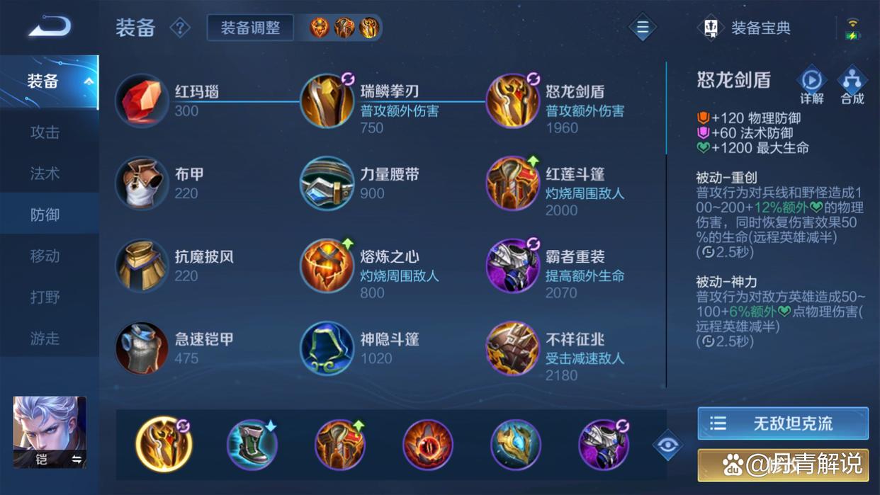 走边路的铠,没有蓝BUFF的加持,所以护甲装优选极寒风暴,在红莲斗篷、不死鸟之眼、霸者重装等装备的基础上,首先安排的就是怒龙剑盾。