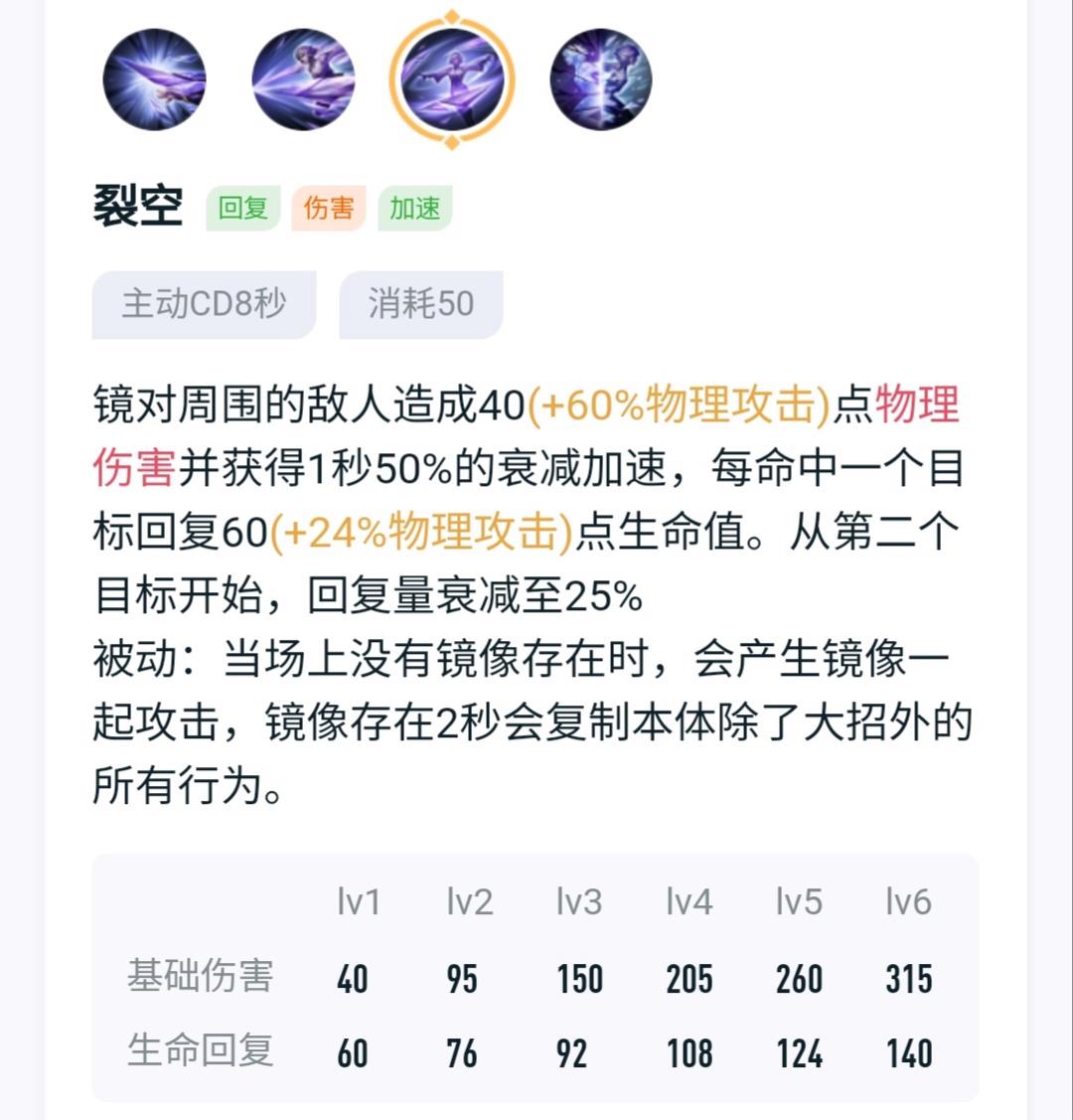 主要伤害技能,发育良好1a1a就可以大残对手,因为本体和镜像距离越远伤害越高,因此打野时可以先1技能,等读条结束1a1a加惩。