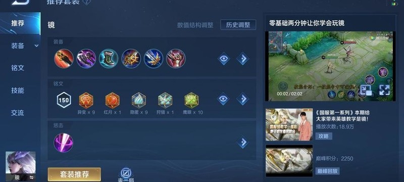二技能冷却时间。镜像造成本体30%的伤害和回复 ,且镜像和本体距离越远,伤害和回复越高,最多增至本体的80% 。 一技能 - 开锋 镜片包裹身体快速突进,对路径上敌人造成物理伤害 二技能 - 裂空 镜对周围敌人造成物理伤害,获得衰减加速 三技能 - 见影 身化为镜朝前飞出,对路径上敌人定身1秒 二铭文搭配 10隐匿、10鹰眼、10异变。隐匿提供物理攻击和移速,鹰眼和异变组成百穿铭文,让镜在前期就能打出高额物理伤害。