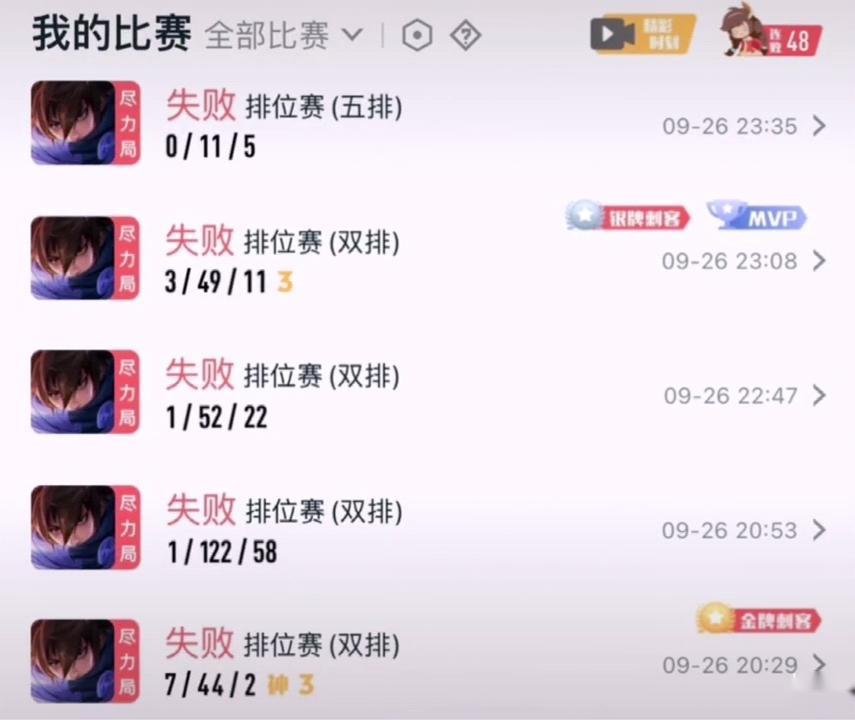 仔细看战绩,单场阵亡122次还不算离谱,3-49的战绩居然拿到了银牌?而且还是三杀,还拿到了败方MVP,另外一场7-44的游戏中,居然是七连杀超神,拿到金牌刺客称号,这样的战绩实属离谱,而且也让人感到怀疑。