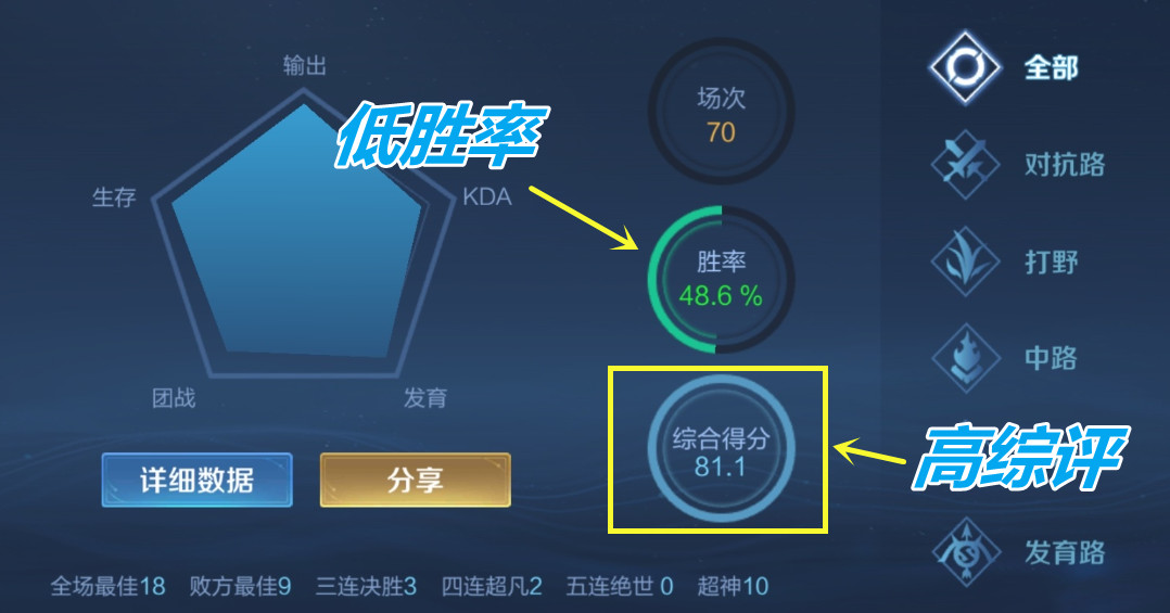 所以,所谓的高评分低胜率其实大部分原因都在玩家本身。MOBA游戏并不只是技术好就能赢的,不然王者局里面都是中学生了。