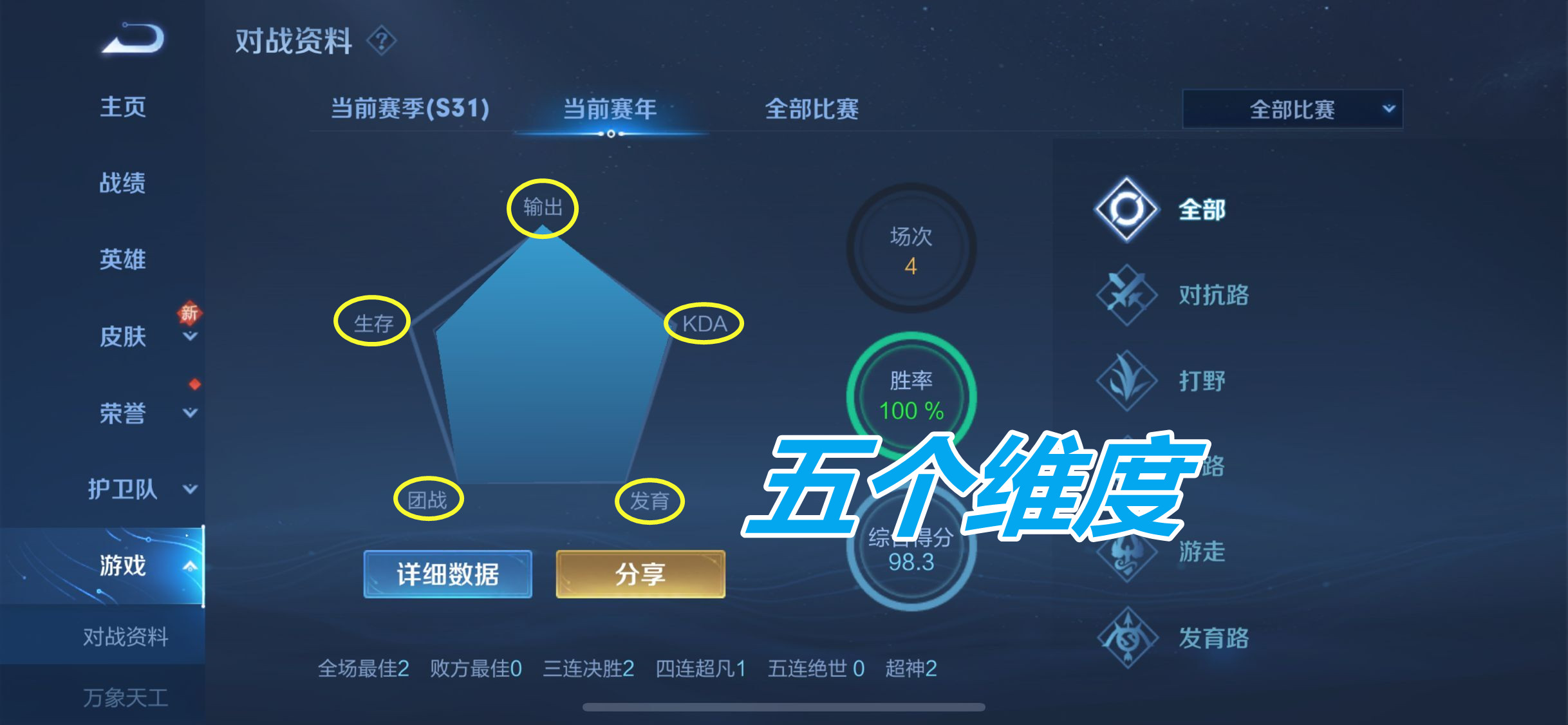 首先我们需要知道,综合评分数据的来源,主要有五个维度,分别是生存,输出,KDA,团战还有发育。
