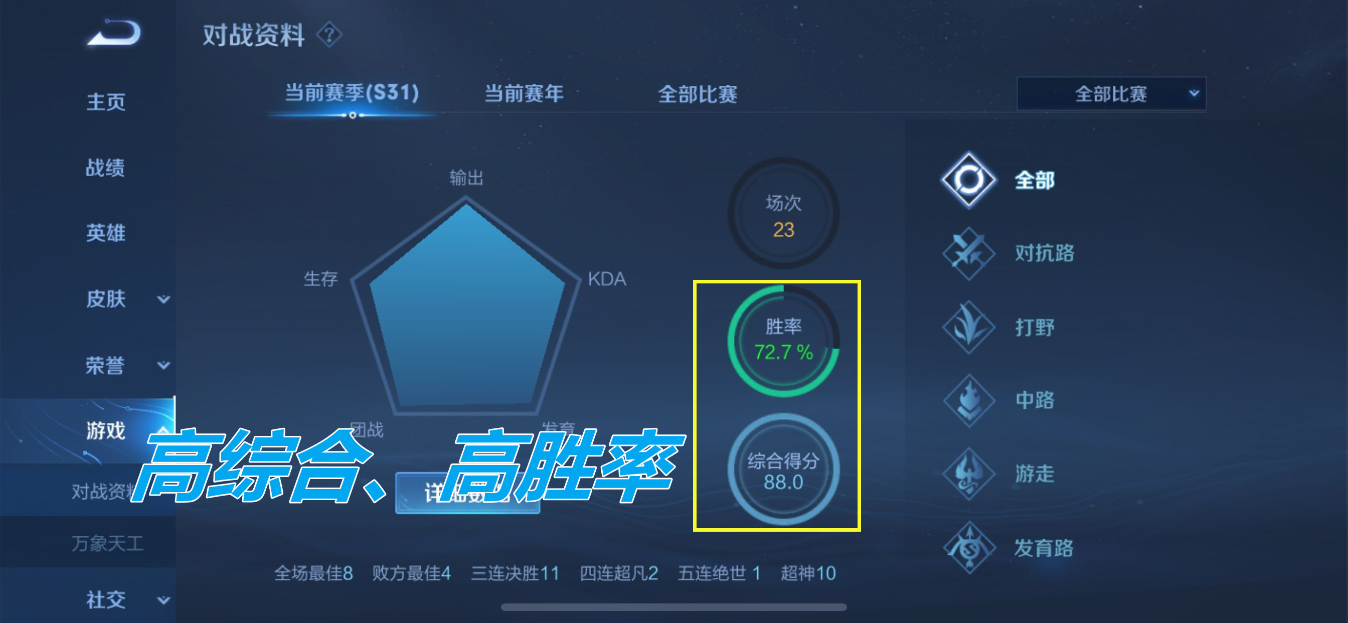 现在知道,为什么现在高综评低胜率的玩家越来越多了吧,游戏的取胜点,不是KDA多漂亮,也不是需要击杀多少个人,而是怎么去运营兵线,如何去推进推塔,怎么去打团,带着队友拿到胜利。