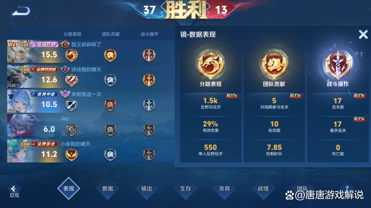 这把选用镜打野获得15.5评分顶级打野的对局,9条重要数据表现都是金色的,其中能达到前1%的有4条,这基本涵盖了打野最需要做的事。