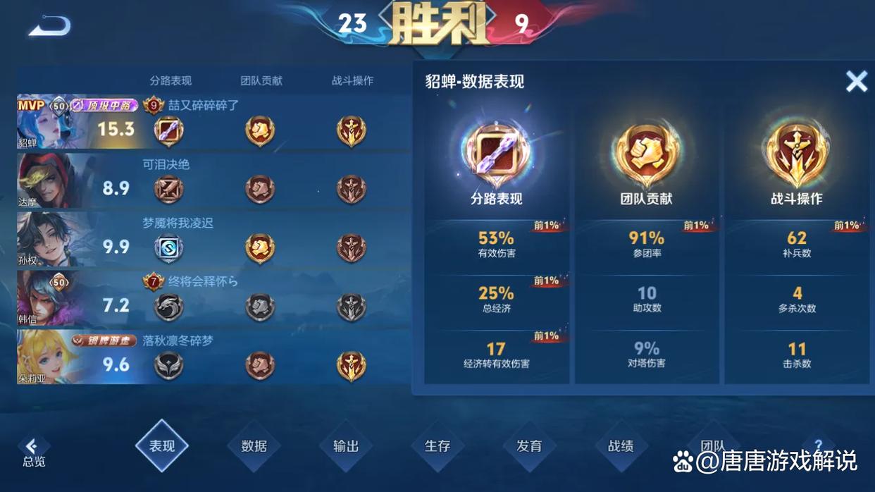 这把用貂蝉获得15.3评分顶级中路的对局,达到金色评级的表现有7条,而排名前1%的数据高达5条,伤害数值和参团率太亮眼了。
