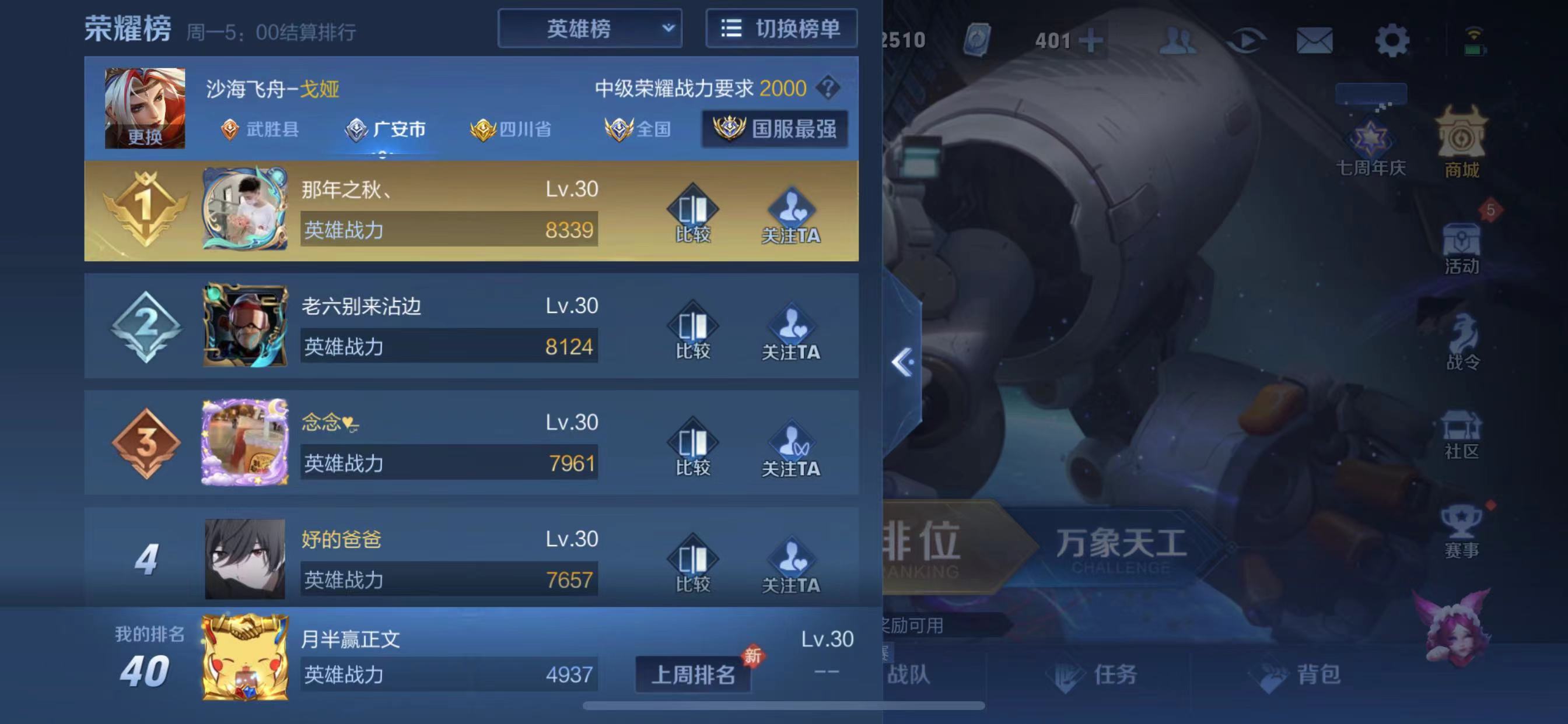 然后回到正题,战区定位完成之后,你就可以查看你所在战区每个排名表所需分数,开头我放的截图的里面标注的二那里点击进去,记住点之前要看好友头像上面是否显示的排行两个字,如果是显示的好友(跟狗蛋截图一样),就要切换一下,显示排行后,点击就会出现如下界面: