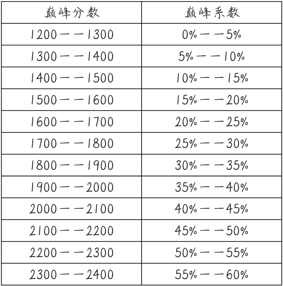 ④巅峰系数分与其他三种战力不太一样,它增加的是全英雄的百分比战力,具体加分情况根据巅峰分改变,巅峰每20分就会获得1%,也就是说你的基础荣耀战力越高,巅峰系数加的战力就越多,另外这还是唯一一个无上限的战力分,这也是那些微信区富婆一个个战力英雄能破两万的原因。