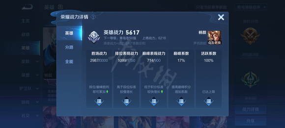 ⑤活跃系数分和我们本身的英雄战力并没有太大关系,并且它的初始分数就是100%满的,只有长时间不打一个英雄才会减少,但是要记住,活跃分减少的同时它也会扣除你一部分的荣耀战力,只有在重新用这个英雄打排位/巅峰赛并且获得胜利时才能拿回被扣除的战力和活跃分,这也是为什么很多玩家一把加7-800战力的原因,不是你打的太厉害,只是把你原先扣除的战力还你而已。