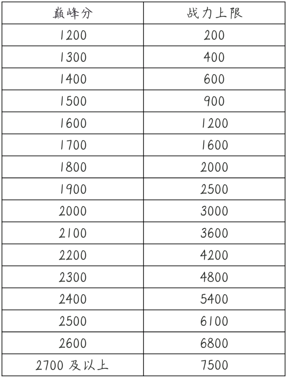②排位表现分上限是2500分,它会根据你的历史评分和本场评分来决定你加/减分数的多少,获取难度极大,除非保持极高胜率或连胜否则是很难打满的,而且每个段位都有固定的上限分(具体如下图),举个例子:如果你在37星就把2250表现分打满,那么在你到40星之前就不会再加表现分了,而如果你正好战绩分也打满了,就会出现赢一把游戏+0战力的尴尬情况(如上图)